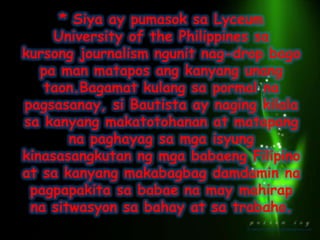 Talambuhay ni Lualhati Bautista. Ang buong kwento ng paghuhukom Essays and Research Papers. Nagsimula ang kwento ng nobela sa pag daan ng mga araw na si Fak ay ginagamot ang kanyang mga sugat na natamos sa pagbubugbog sa kanya.