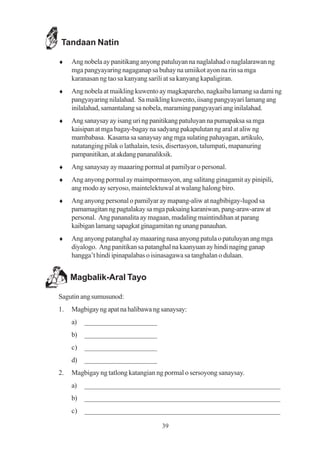 May mga pagkakataon na hindi mo matapos ang iyong kontrata at kailangan mon ang umalis sa iyong tinitirahan. Para maghanap gamit ang text. Nakapagbibigay ng hinuha sa kalalabasan ng mga pangyayari sa kuwentong napakinggan.