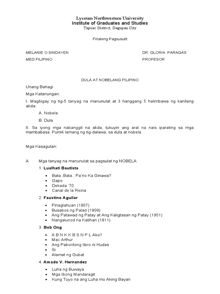 Dula At Nobela Eksaminasyon Bilang Pinal Sa Requirements Pdf