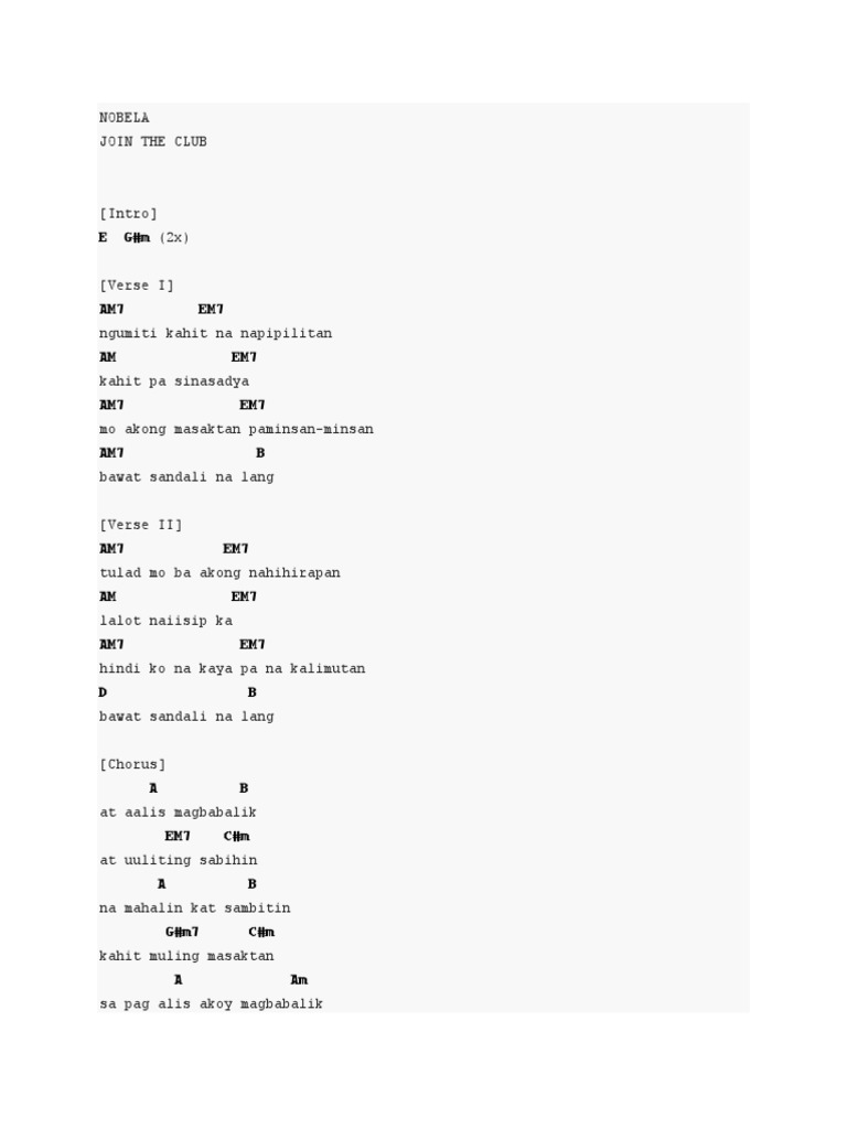 NOBELA by Join the Club easy chords Intro EGmEGmA Verse A E ngumiti kahit na napipilitan A E kahit pa sinasadya A E mo akong masaktan paminsan-minsan A B break kahit sandali na lang A E tulad mo ba akong nahihirapan A E dahil naiisip ka. 1199444 views added to favorites 12546 times. We have an official Nobela tab made by UG professional guitarists.
